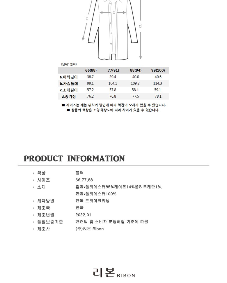 1. 제품 소재 (섬유의 조성 또는 혼용률을 백분율로 표시, 기능성인 경우 성적서 또는 허가서) 겉감:폴리에스터85%레이온14%폴리우레탄1%,안감:폴리에스터100%