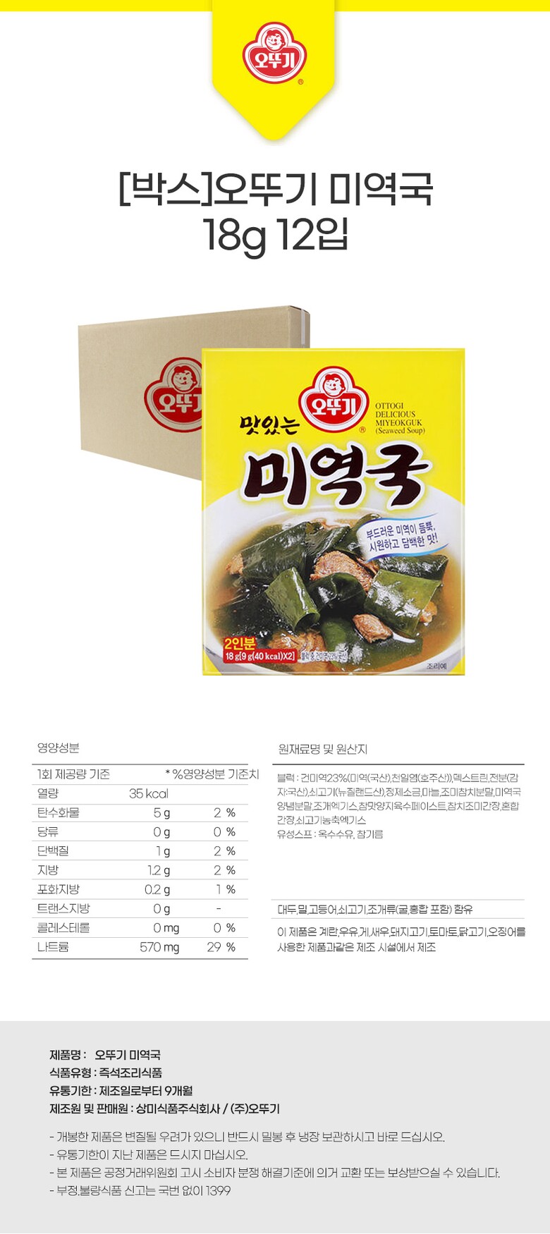 해당 상품은 여러가지 구성이 있으니 구매를 원하시는 구성의 상품명과 상세페이지의 내용이 일치하는지 확인 후 구매 부탁드립니다. 해당 상품은 [[박스]오뚜기 미역국 18g 12입 (216g) ] 구성의 상품입니다.