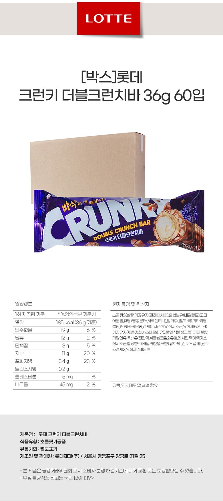 해당 상품은 여러가지 구성이 있으니 구매를 원하시는 구성의 상품명과 상세페이지의 내용이 일치하는지 확인 후 구매 부탁드립니다. 해당 상품은 [[박스]롯데 크런키 더블크런치바 36g 60입 (2160g) ] 구성의 상품입니다.