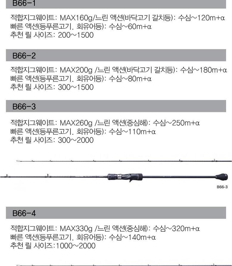 품명 | 전장 (m) | 절수 (본) | 접은길이 (cm) | 자중 (g) | 선경 (mm) | 적합지그 무게(g) | 적합라인 PE(호) | 최대드랙 | 릴시트 위치(mm) | 카본 함유율(%) |
