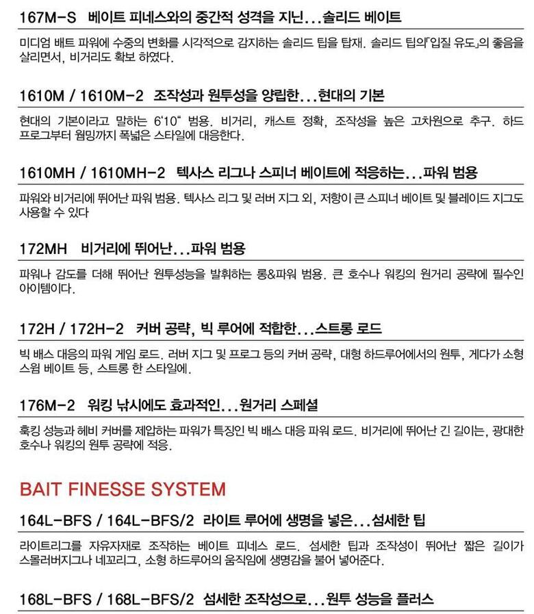 | 품명 | 전장(m) | 절수(본) | 접은길이(cm) | 자중(g) | 선경(mm) | 적합루어무게(g) | 적합라인 나일론?후로로(lb) | 그립길이(mm) | 테이퍼 | 카본함유율(%) |