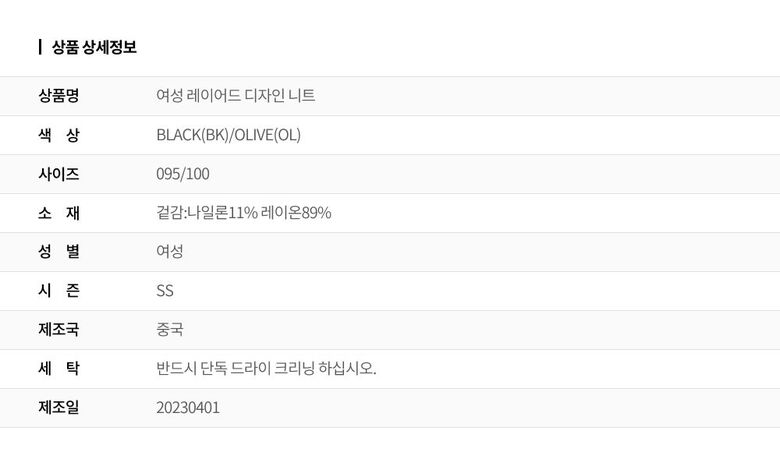 1. 제품 소재 (섬유의 조성 또는 혼용률을 백분율로 표시, 기능성인 경우 성적서 또는 허가서) | 겉감:나일론11% 레이온89% |