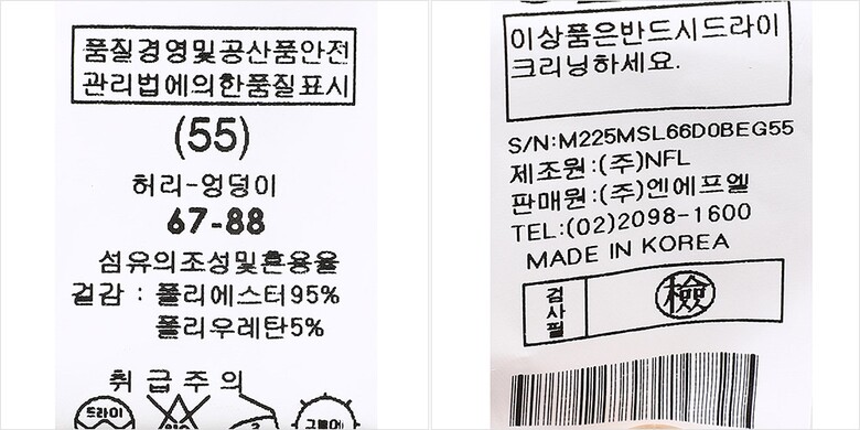 | 1. 제품 소재 (섬유의 조성 또는 혼용률을 백분율로 표시, 기능성인 경우 성적서 또는 허가서) | 겉감:폴리에스터95% 폴리우레탄5% |