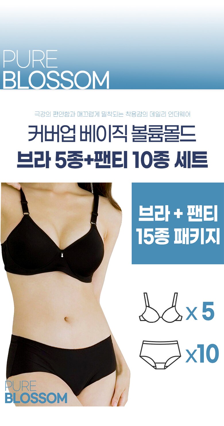 스벅 쿠폰 증정 [퓨어블라썸][15종세트] 커버업 베이직 노와이어 볼륨몰드 브라5+팬티10 세트/빅사이즈