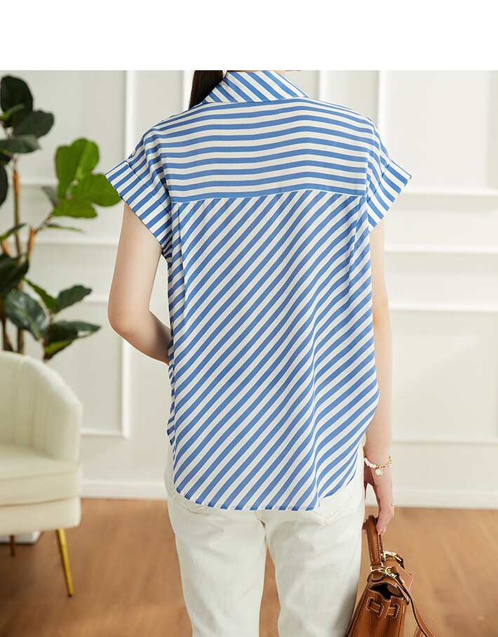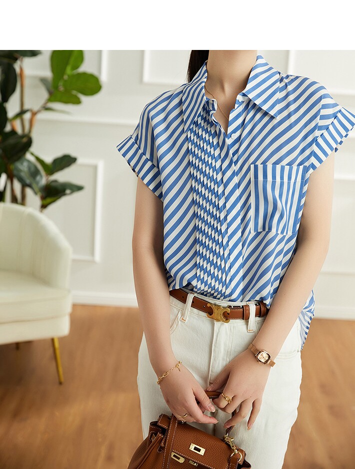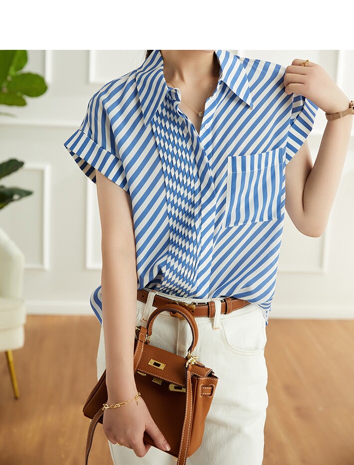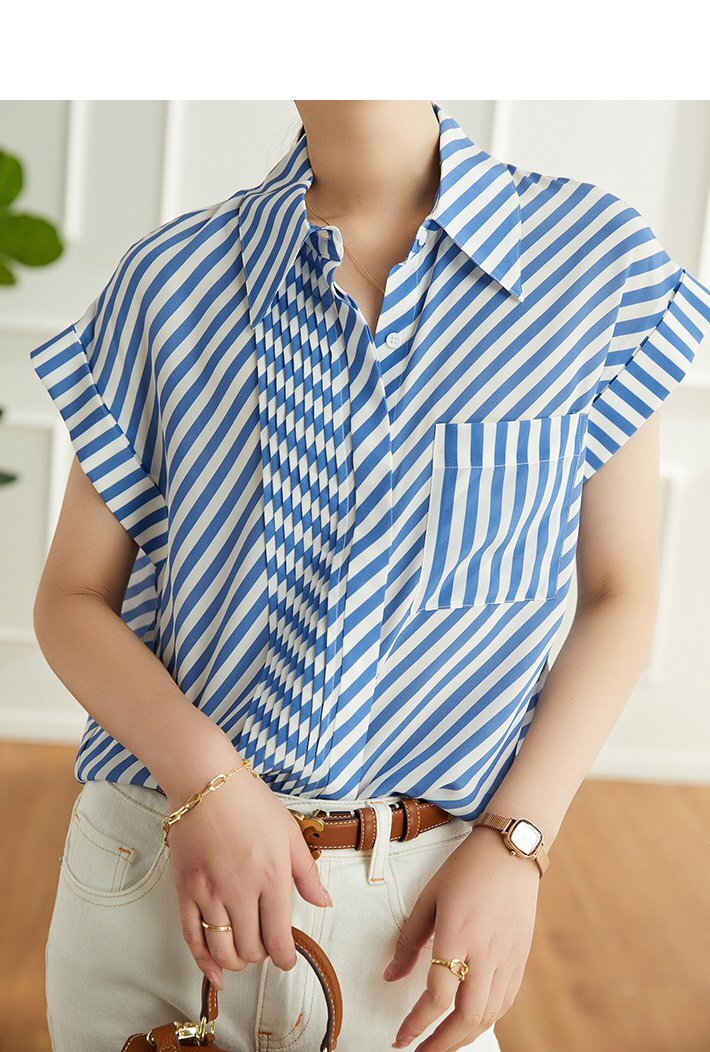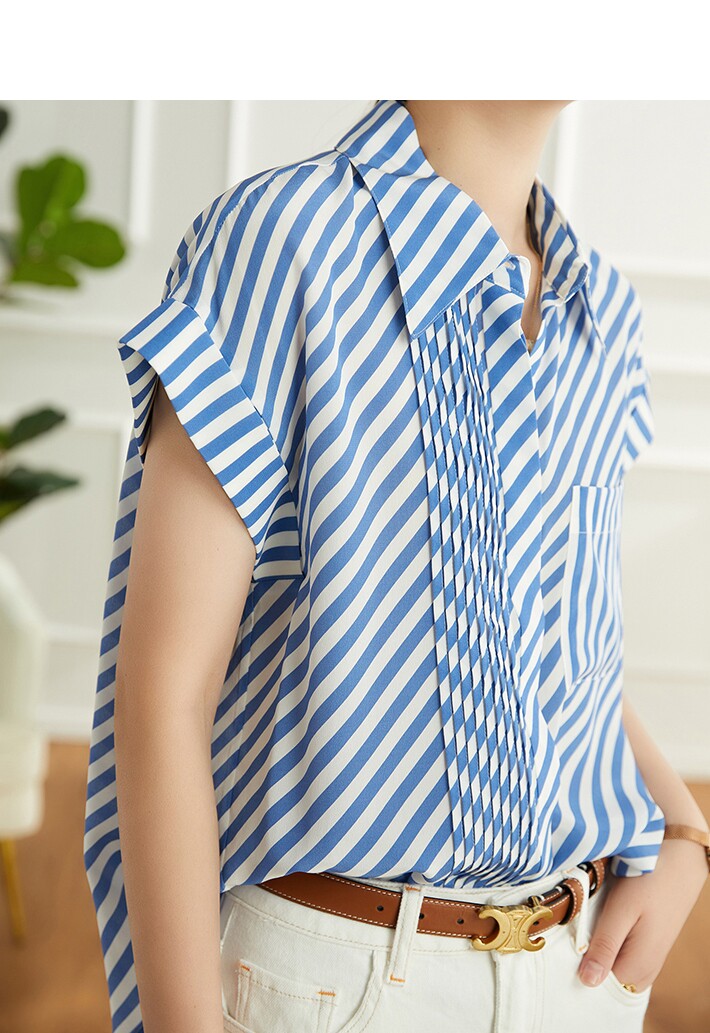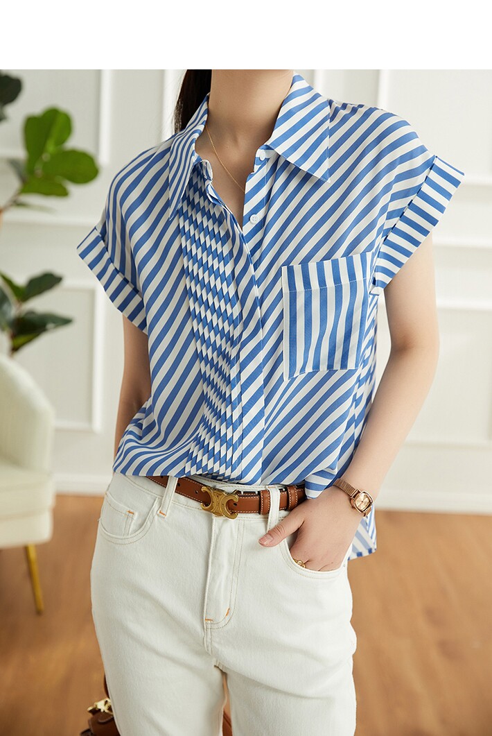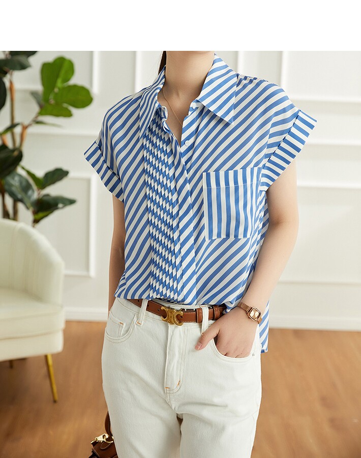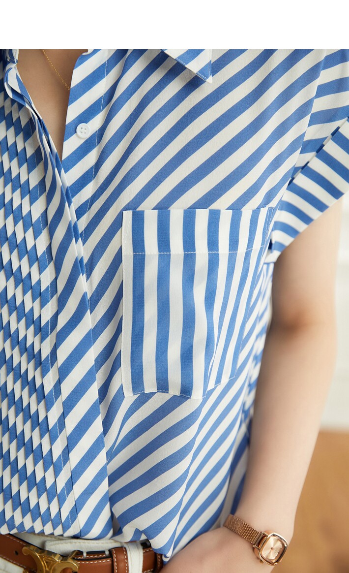 와일스 사선 스트라이프 포켓 반소매 블라우스