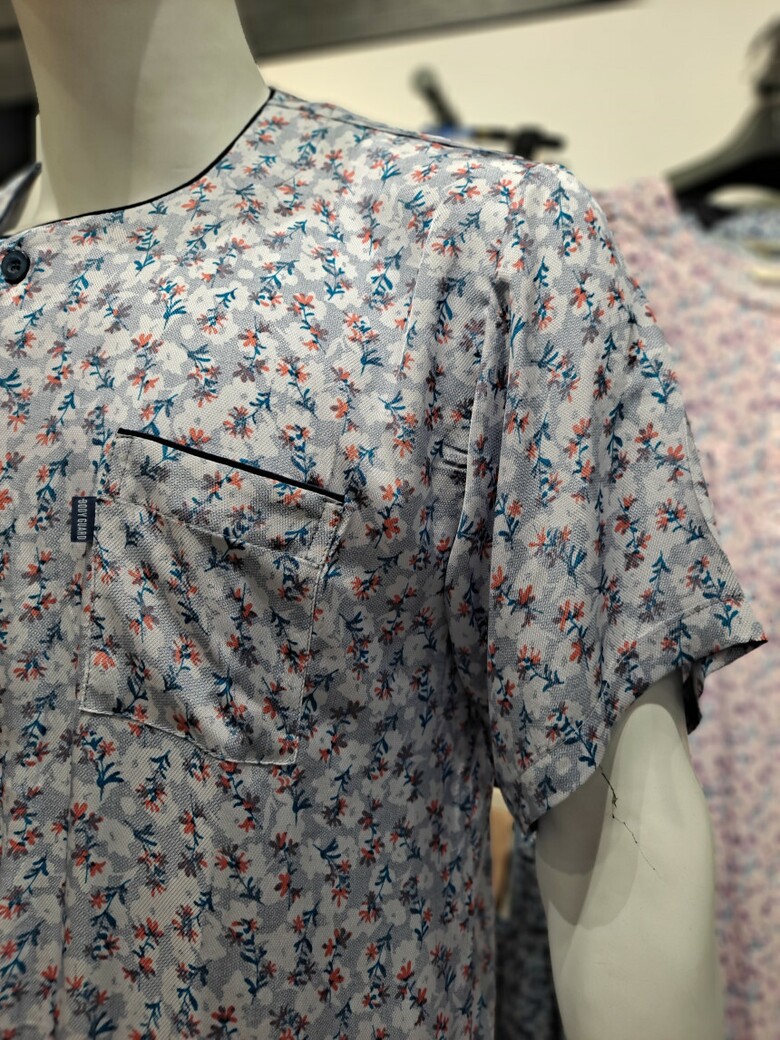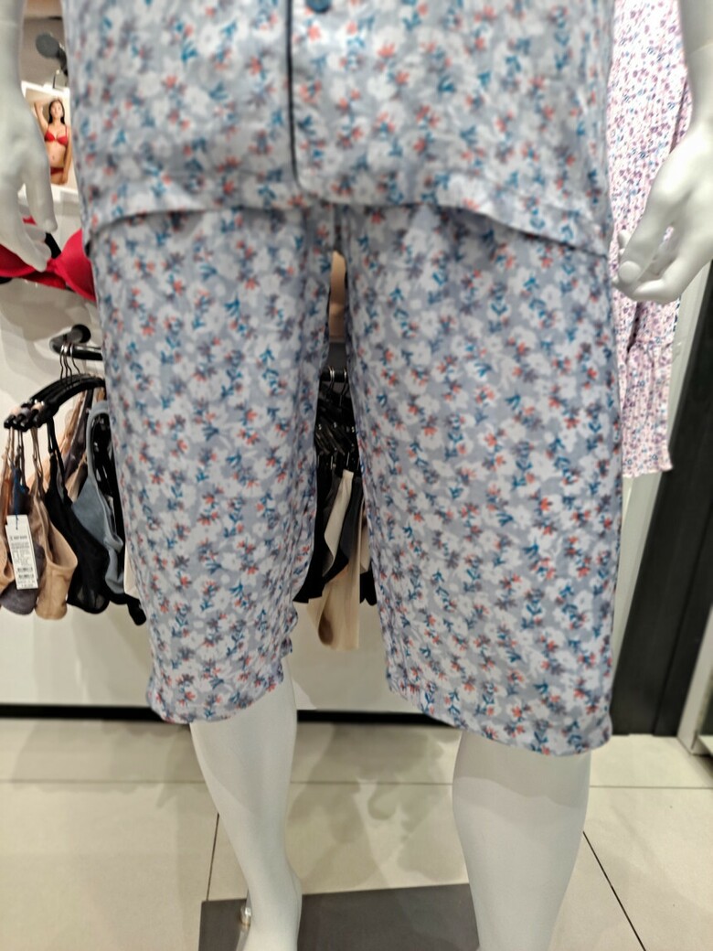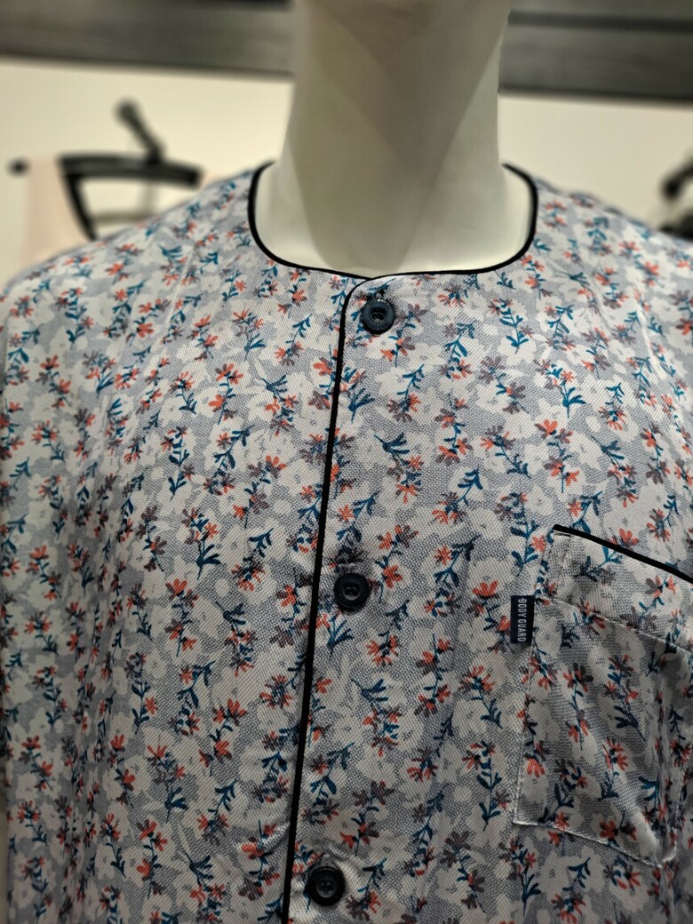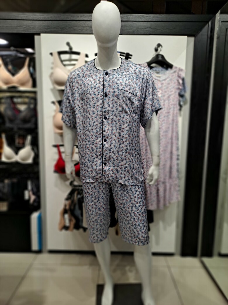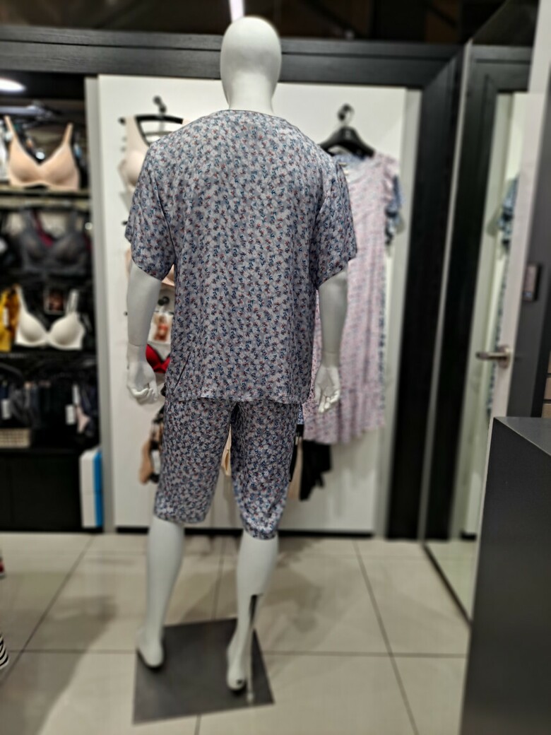 블루컬러톤의 플라워 패턴과 소재의 매치가 청량함을 제공하며 라운드 형태의 넥크라인이 편안한 인견 파자마 세트