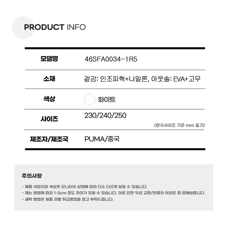 | 1. 제품 소재 (운동화인 경우에는 겉감, 안감을 구분하여 표시) | 겉감: 인조피혁+나일론, 아웃솔: EVA+고무 |