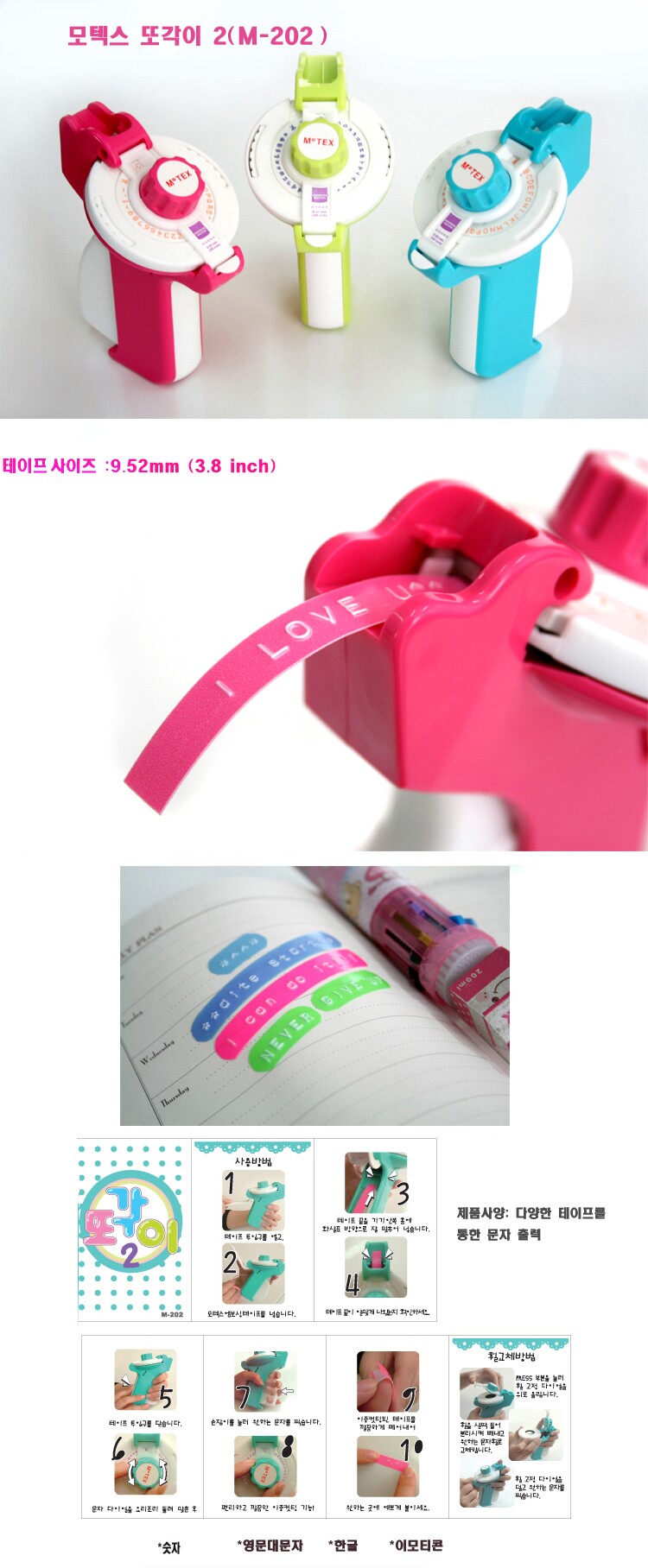 [모텍스] 라벨기 또각이2 M-202 3컬러 (한글+영문+이모티콘+숫자테잎1개포함)