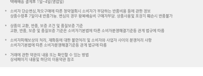 상품불량에 의한 반품, A/S, 품질보증 및 피해보상 등에 관한 사항은 소비자 분쟁해결기준(공정거래위원회 고시) 구매자가 미성년자인 경우에는 상품 구입시 법정대리인이 동의하지 아니하면 미성년자 본인 또는 법정대리인이 구매취소 할 수 있습니다. |