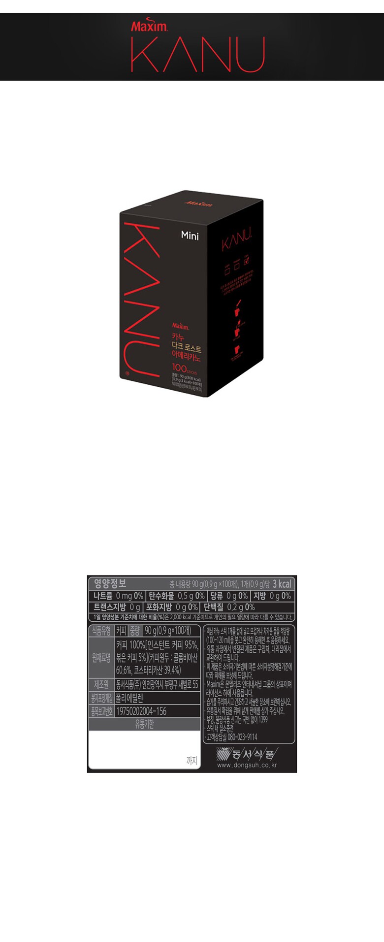 | 1. 포장단위별 용량(중량),수량,크기 | 415705 카누 원두커피 Y 다크 미니 100T |