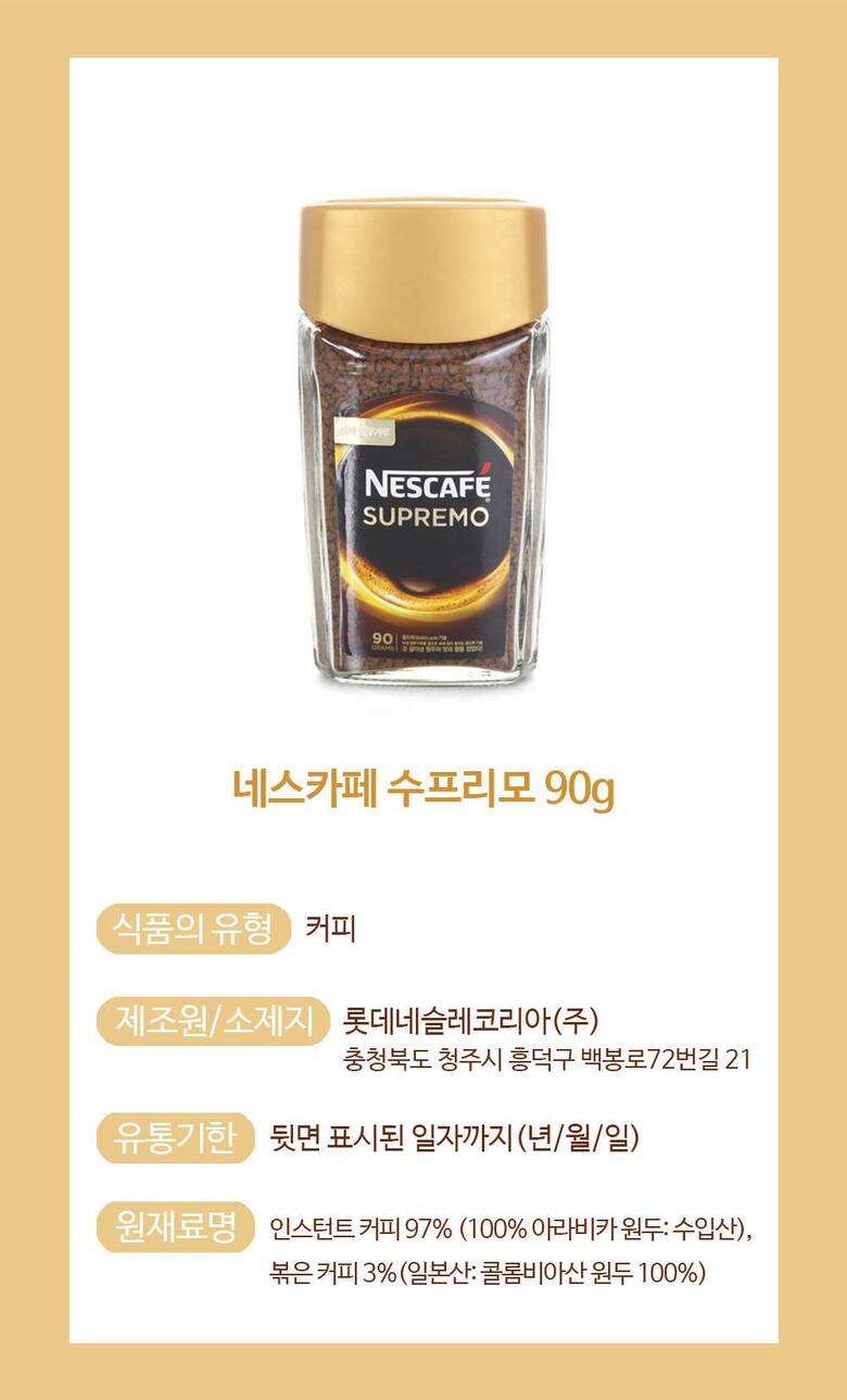 | 1. 포장단위별 용량(중량),수량,크기 | 1870961네스카페 커피 수프리모 90g병1870961 |