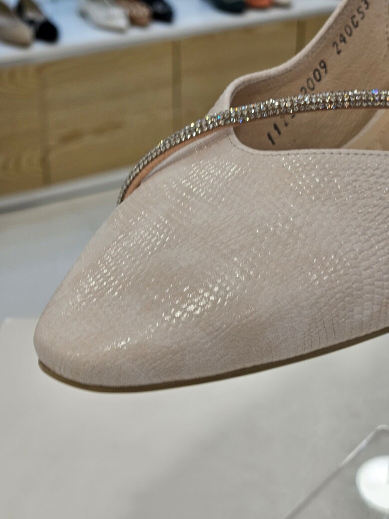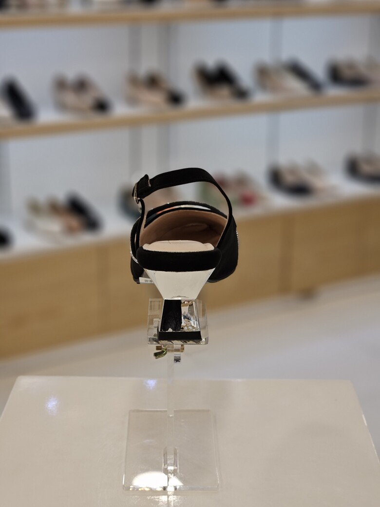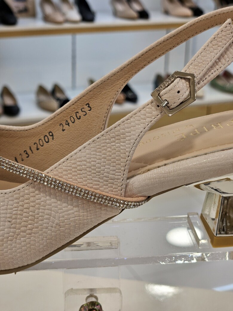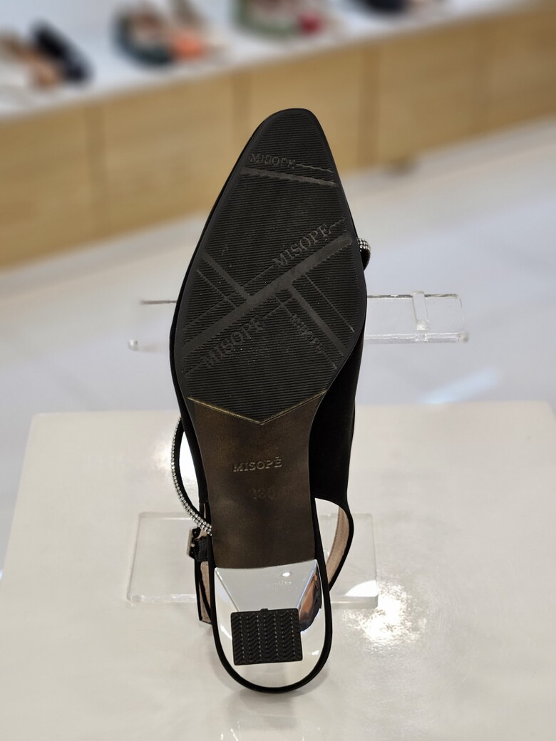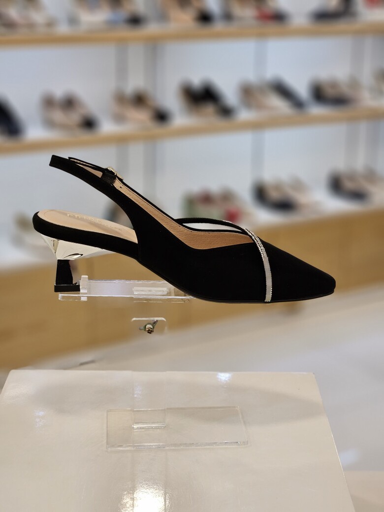 ▶ 은은한 물결무늬패턴과 핫픽스띠로 반짝이는 포인트를 준 슬링백 힐