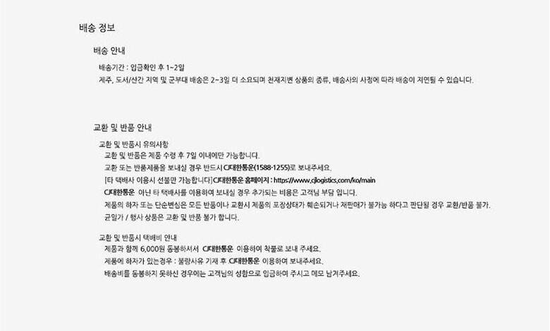 • 모든 규정은 전자상거래법에 의거하며, 택배사정으로 배송이 지연된 경우 재화를 공급받은 날로부터 7일 이내에 반품 가능합니다.