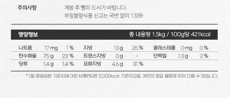 8. 보관방법,취급방법 | 직사광선을 피하고 서늘한곳에 보관/개봉후 가급적 빨리 드시길 권장 |