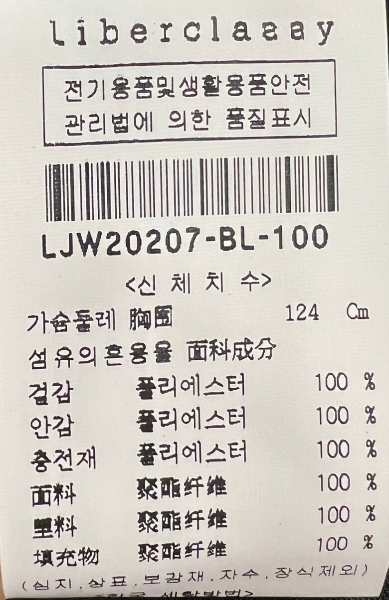 1. 제품 소재 (섬유의 조성 또는 혼용률을 백분율로 표시, 기능성인 경우 성적서 또는 허가서) 안감:폴리에스테르 100% / 충전재:폴리에스테르 100%
