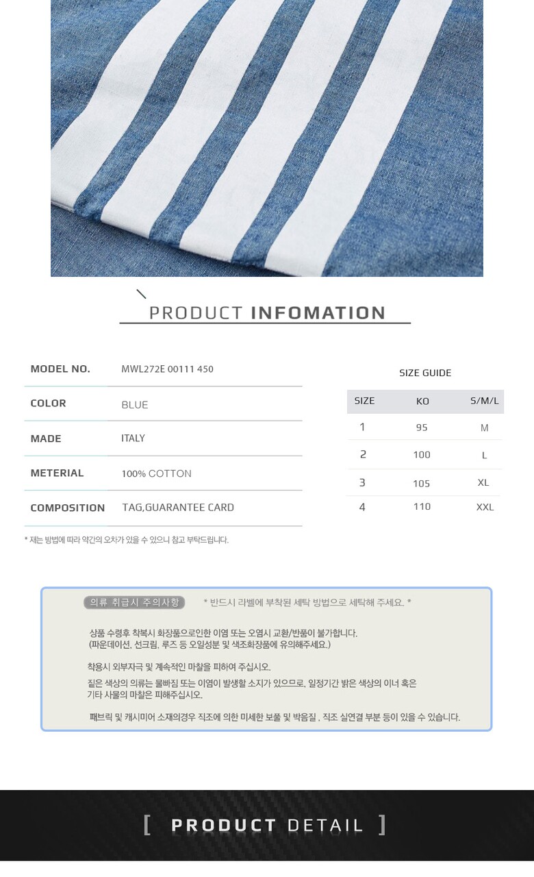 1. 제품 소재 (섬유의 조성 또는 혼용률을 백분율로 표시, 기능성인 경우 성적서 또는 허가서) | 100% COTTON |
