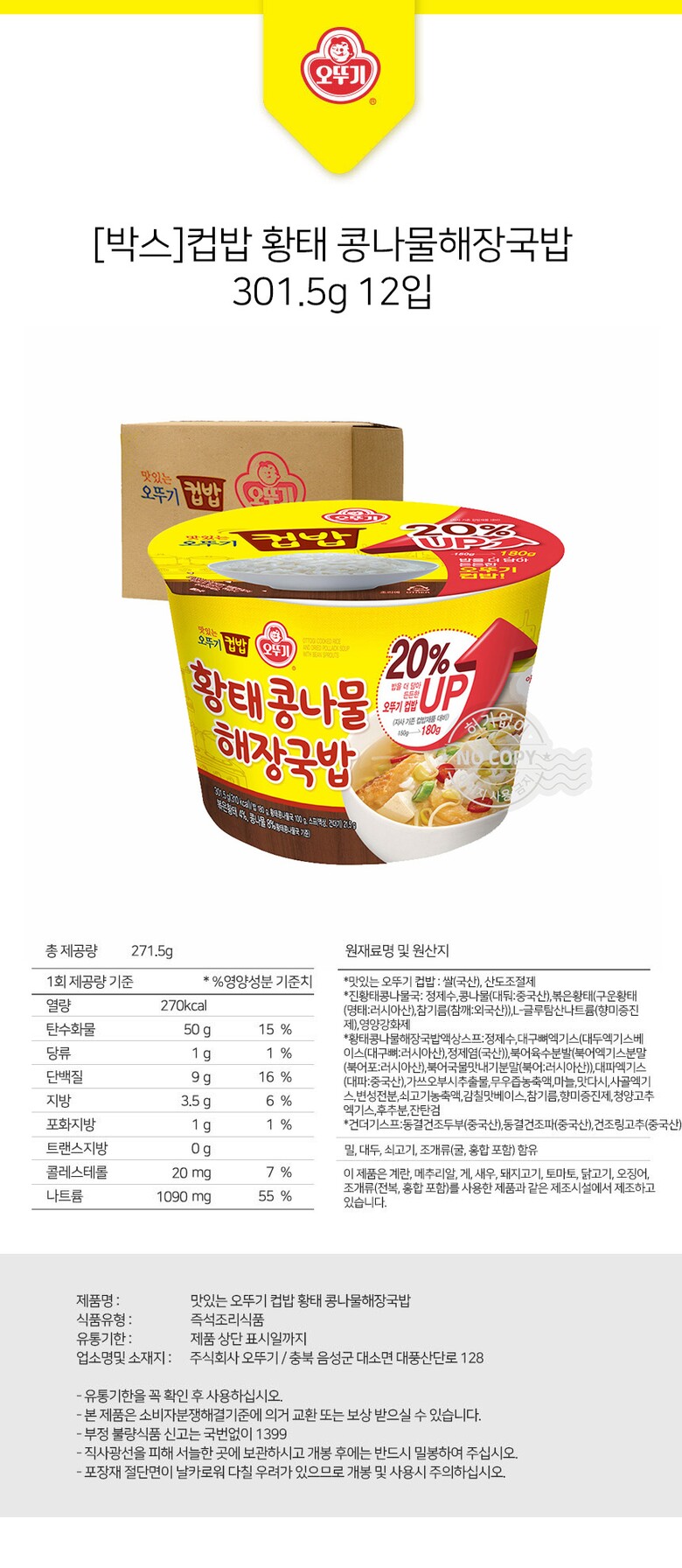 오뚜기 컵밥 황태콩나물 해장국밥 301.5g 12개입 [박스]