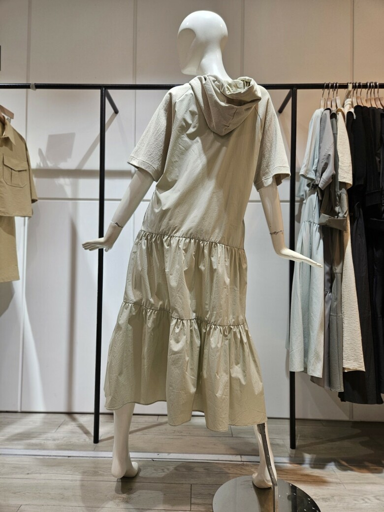서로 다른 텍스처의 조화가 매력적인 후드 플리츠 원피스입니다.