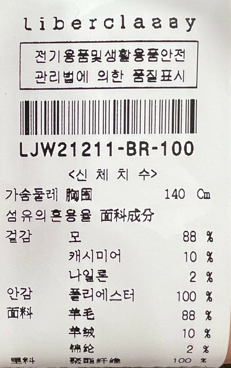 | 1. 제품 소재 (섬유의 조성 또는 혼용률을 백분율로 표시, 기능성인 경우 성적서 또는 허가서) | 겉감:모 88%, 캐시미어 10%, 나일론 2% / 안감:폴리에스테르 100% |