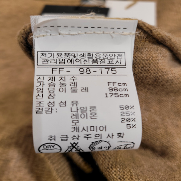 | 1. 제품 소재 (섬유의 조성 또는 혼용률을 백분율로 표시, 기능성인 경우 성적서 또는 허가서) | 나일론50%,레이온25%,모20%,캐시미어5% |