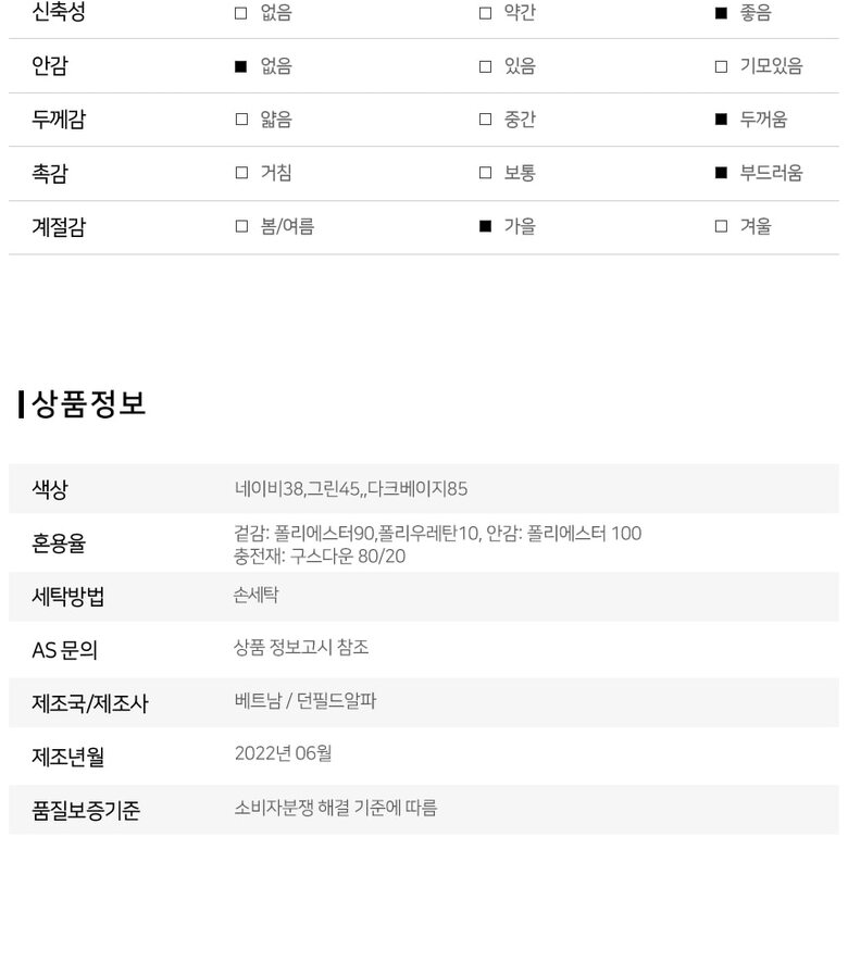 제품소재 : 겉감-폴리에스터90%,폴리우레탄10%/안감-폴리에스터100%/충전재-구스다운 솜털80%,깃털20%