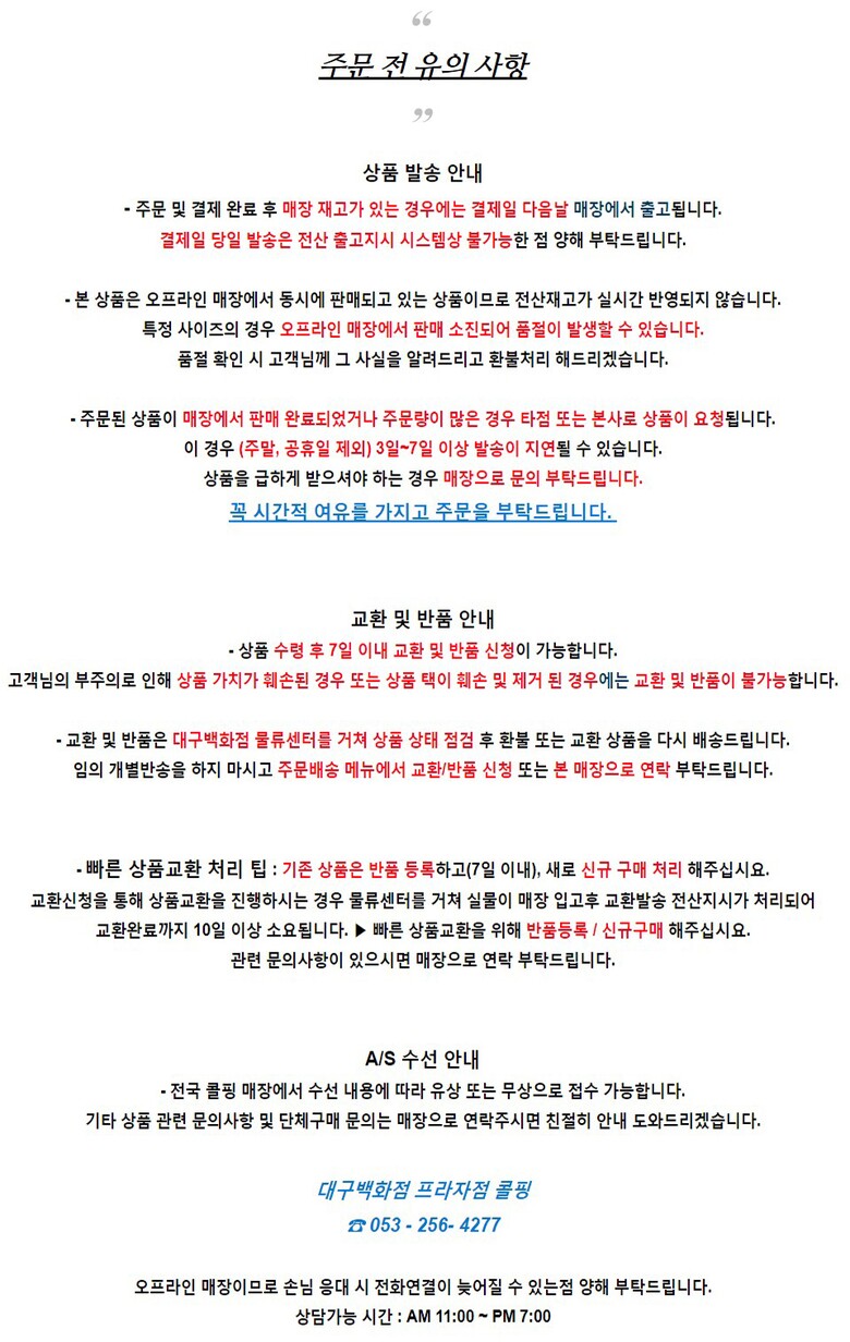 A/S 책임자와 전화번호 : AS 및 기타 문의 사항은 해당 매장 [김연호,053-256-4277] 으로 전화주시면 감사하겠습니다.