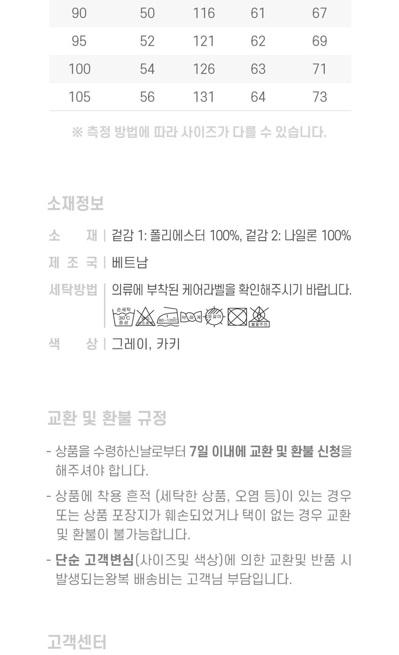 | 6. 세탁방법 및 취급시 주의사항 | 상세페이지참조 |