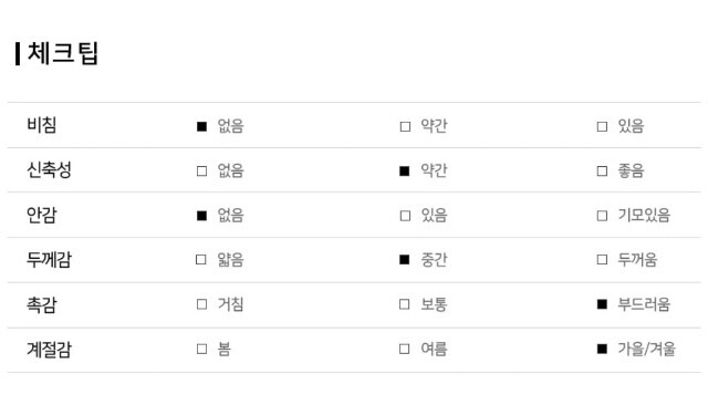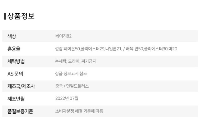 1. 제품 소재 (섬유의 조성 또는 혼용률을 백분율로 표시, 기능성인 경우 성적서 또는 허가서) | 상품상세참조 |