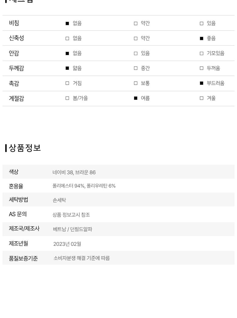 1. 제품 소재 (섬유의 조성 또는 혼용률을 백분율로 표시, 기능성인 경우 성적서 또는 허가서) | 폴리에스터94%,폴리우레탄6% |