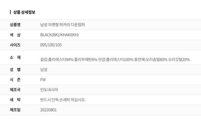 | 1. 제품 소재 (섬유의 조성 또는 혼용률을 백분율로 표시, 기능성인 경우 성적서 또는 허가서) | 겉감:폴리에스터94% 폴리우레탄6% 안감:폴리에스터100% 충전재:오리솜털80% 오리깃털20% |