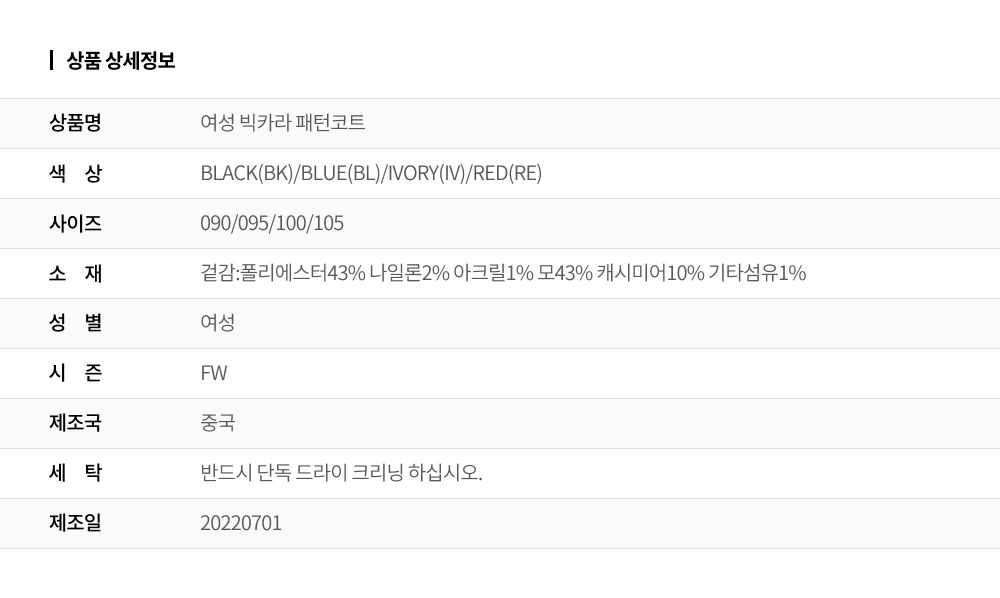 | 1. 제품 소재 (섬유의 조성 또는 혼용률을 백분율로 표시, 기능성인 경우 성적서 또는 허가서) | 겉감:폴리에스터43% 나일론2% 아크릴1% 모43% 캐시미어10% 기타섬유1% |