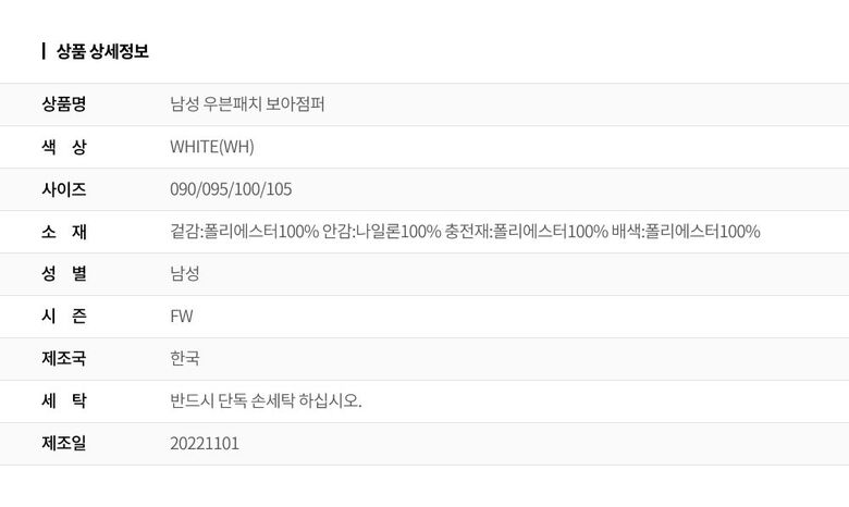| 1. 제품 소재 (섬유의 조성 또는 혼용률을 백분율로 표시, 기능성인 경우 성적서 또는 허가서) | 겉감:폴리에스터100% 안감:나일론100% 충전재:폴리에스터100% 배색:폴리에스터100% |