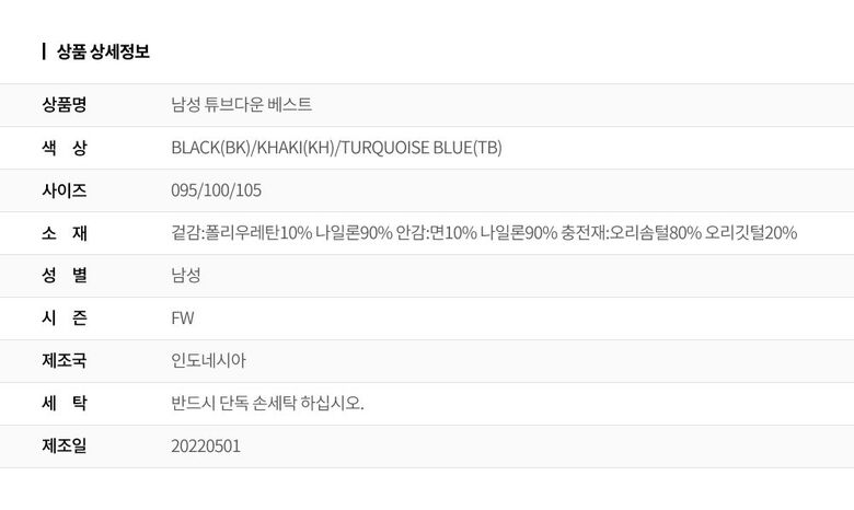 | 1. 제품 소재 (섬유의 조성 또는 혼용률을 백분율로 표시, 기능성인 경우 성적서 또는 허가서) | 겉감:폴리우레탄10% 나일론90% 안감:면10% 나일론90% 충전재:오리솜털80% 오리깃털20% |
