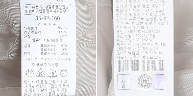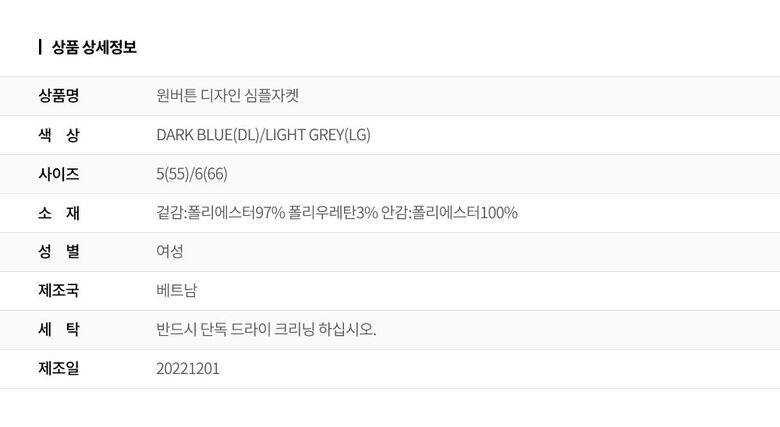 1. 제품 소재 (섬유의 조성 또는 혼용률을 백분율로 표시, 기능성인 경우 성적서 또는 허가서) 겉감:폴리에스터97% 폴리우레탄3% 안감:폴리에스터100%