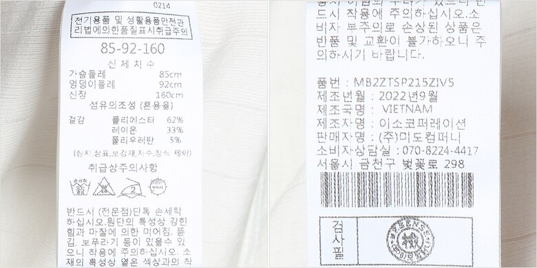 | 1. 제품 소재 (섬유의 조성 또는 혼용률을 백분율로 표시, 기능성인 경우 성적서 또는 허가서) | 겉감:폴리에스터62% 폴리우레탄5% 레이온33% |