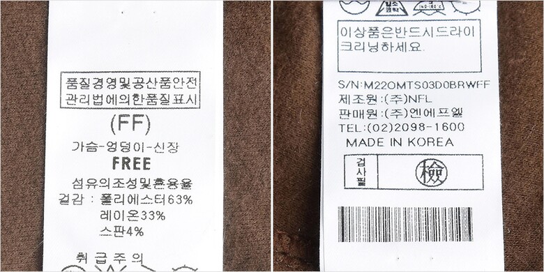 | 1. 제품 소재 (섬유의 조성 또는 혼용률을 백분율로 표시, 기능성인 경우 성적서 또는 허가서) | 겉감:폴리에스터63% 레이온33% 스판4% |