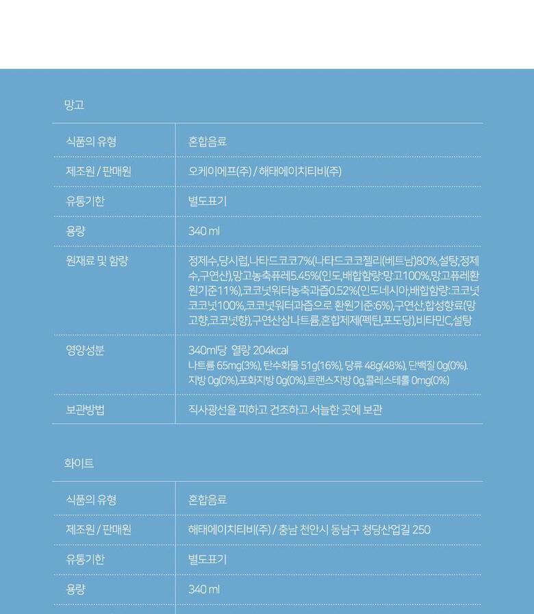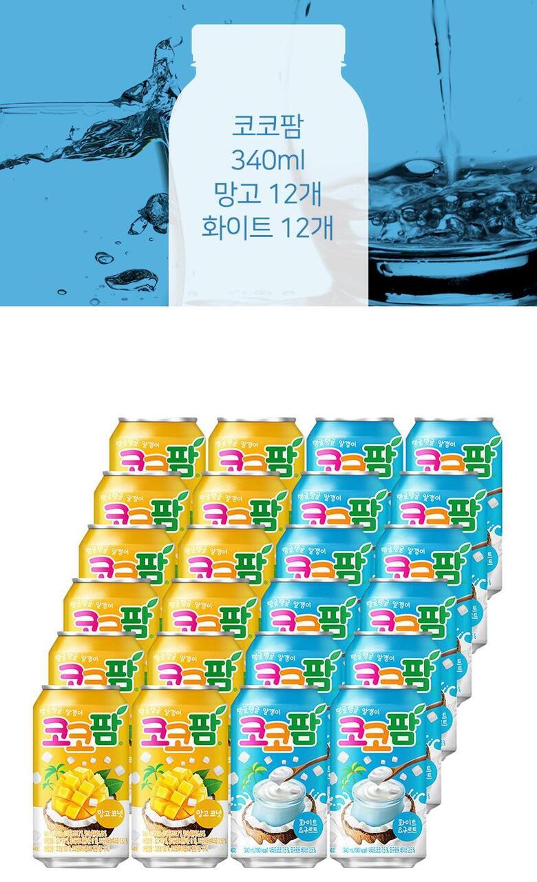상세페이지의 내용이 일치하는지 확인 후 구매 부탁드립니다. 해당 상품은[ 해태 코코팜 340ml 망고 + 화이트 혼합 24개 ] 구성의 상품입니다.