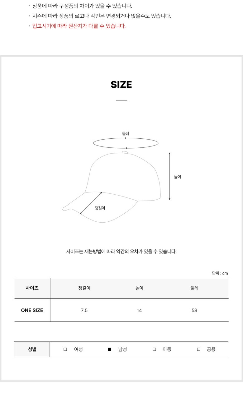 3. 치수 챙길이 7.5cm X 높이 14cm X 둘레 58cm