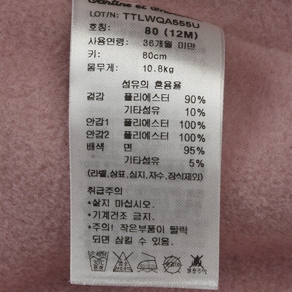 6. 세탁방법 및 취급시 주의사항 | 단독세탁.삶지마십시오.기계건조금지주의!작은부품이 탈락되면 삼킬수있음 |