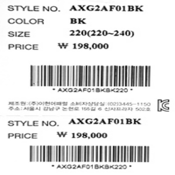 | 1. 제품 소재 (운동화인 경우에는 겉감, 안감을 구분하여 표시) | AXG2AF01BK |