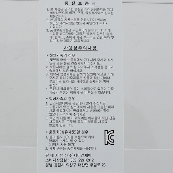 | 6. 취급시 주의사항 | 1.건조시킬때에는 응달에서 말려주십시오.2.찬물에 적신천이나 부드러운 부러쉬를 사용하고 물세탁은 피해주십시오. |