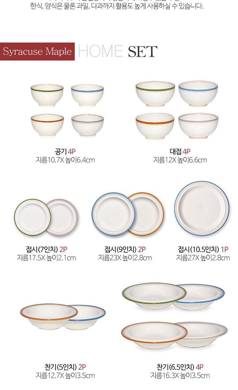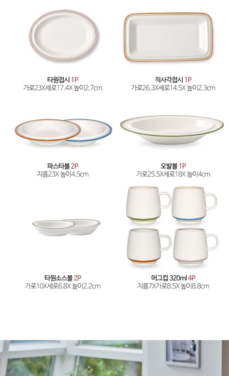 3. 구성품 | 공기 4p, 대접 4p, 접시 17.5cm 2p, 접시 23cm 2p, 접시 27cm 1p, 찬기 13cm 2p, 찬기 16cm 4p, 타원접시 1p, 직사각접시 1p, 파스타볼 2p, 오발볼 1p, 타원소스볼 2p, 머그컵 4p |