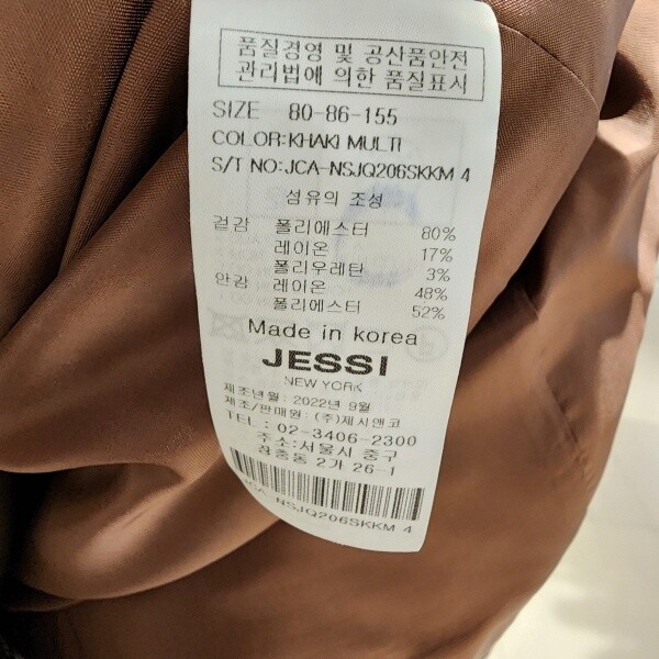 제품소재 : 폴리에스터80%레이온17%폴리우레탄3% 안감-레이온48%폴리에스터52%
