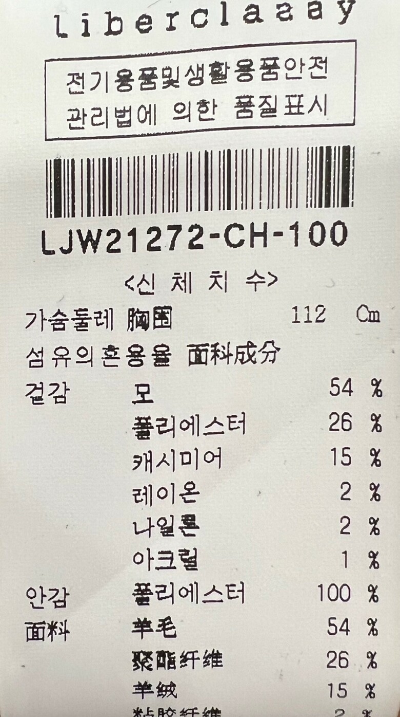 | 1. 제품 소재 (섬유의 조성 또는 혼용률을 백분율로 표시, 기능성인 경우 성적서 또는 허가서) | 겉감:모 54%, 폴리에스테르 26%, 캐시미어 15%, 레이온 2%, 나일론 2 |