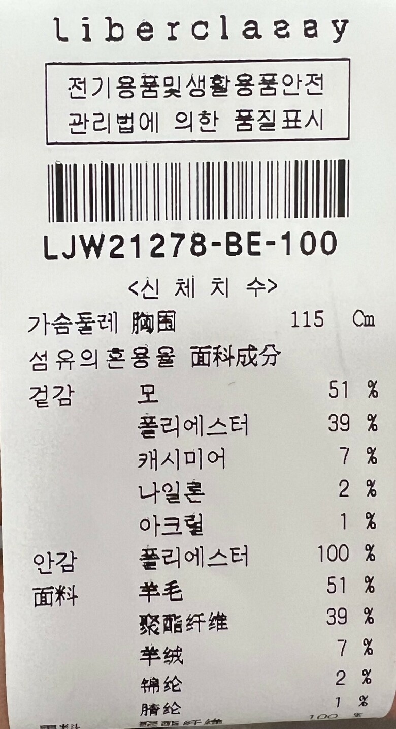 | 1. 제품 소재 (섬유의 조성 또는 혼용률을 백분율로 표시, 기능성인 경우 성적서 또는 허가서) | 겉감:모 51%, 폴리에스테르 39%, 캐시미어 7%, 나일론 2%, 아크릴 1% |