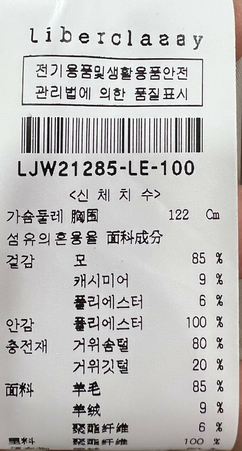 | 1. 제품 소재 (섬유의 조성 또는 혼용률을 백분율로 표시, 기능성인 경우 성적서 또는 허가서) | 겉감:모 85%, 캐시미어 9%, 폴리에스테르 6% / 안감:폴리에스테르 10 |