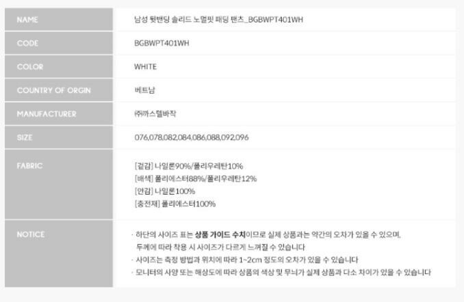 | 1. 품명 및 모델명 | 남성 슬림핏 패딩 바지(폴리솜충전재) |