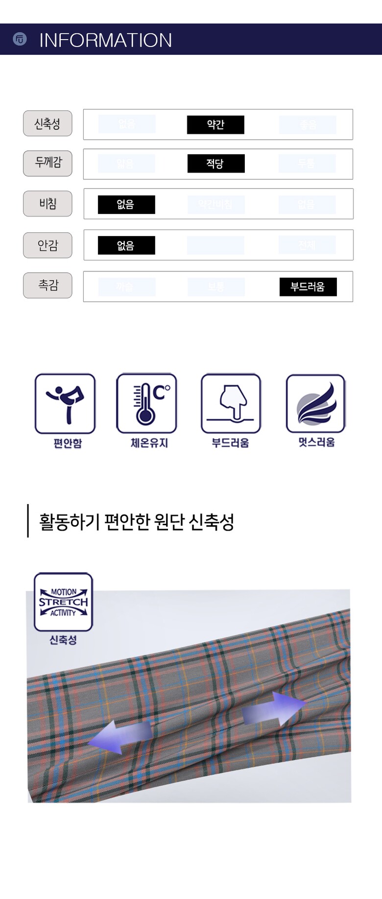 | 1. 제품 소재 (섬유의 조성 또는 혼용률을 백분율로 표시, 기능성인 경우 성적서 또는 허가서) | 상세설명참고 |