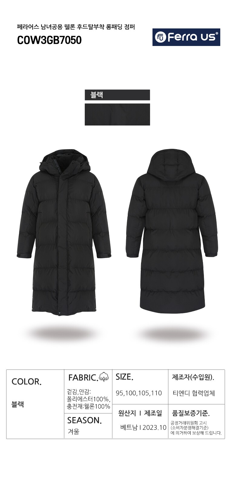 페라어스 남녀공용 웰론 후드탈부착 롱패딩 점퍼 COW3GB7050