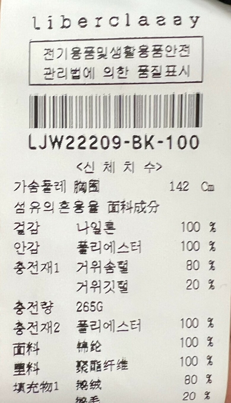 | 1. 제품 소재 (섬유의 조성 또는 혼용률을 백분율로 표시, 기능성인 경우 성적서 또는 허가서) | 겉감:나일론 100% / 안감:폴리에스테르 100% |